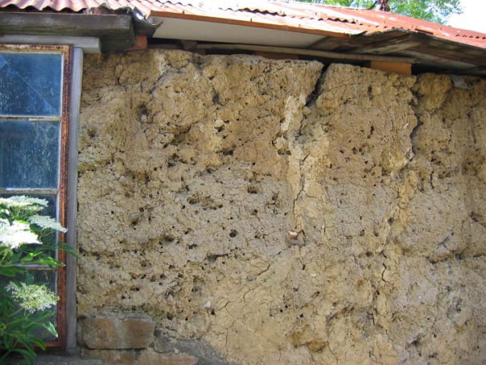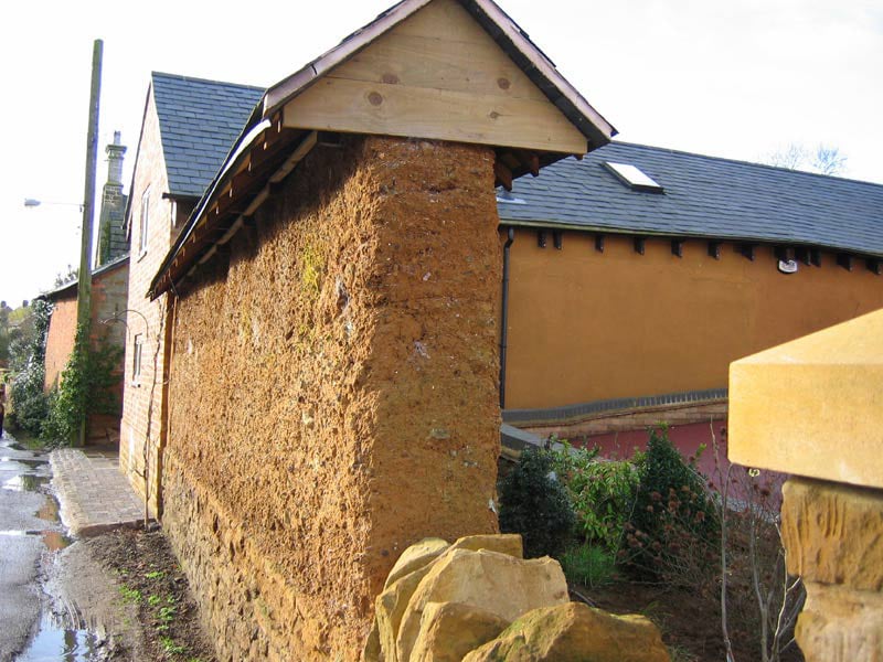 Old earth walls incorporated into modernised old buildings. Although fitted with extended eaves, surface erosion is occurring.
