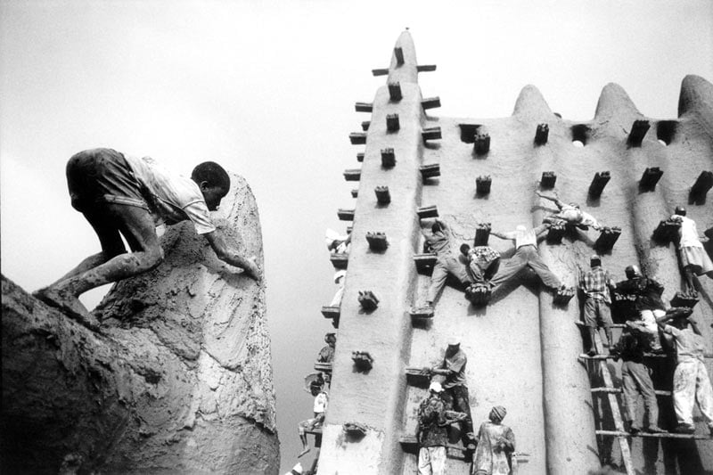 In Mali the Grand Mosque of Djenne is given a new coat of mud plaster each spring to replace the coating washed away by the rainy season (click thumbnail for large image).